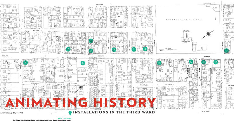 In Spring of 2016, University of Houston students from the College of Art’s Graphic Design Program teamed up with peers in the Gerald D. Hines College of Architecture and Design to offer a glimpse into the Third Ward’s past. The project, “Animating History,” paired students who designed 22 life size map pins (like the ones used to point out locations on online maps) that shared stories and histories of people and places along the Emancipation Avenue corridor. Guiding students were graphic design associate professor Fiona McGettigan and architecture professors Susan Rogers and Ronnie Self. Students physically placed their six-foot pins on their sites across Third Ward. While the project celebrated the rich history of the community, it also called on viewers to question the discriminatory practices that have impacted the Third Ward over decades.