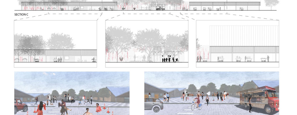 In this project by Melanie Getman, the idea of creating a community social space is the main driver. By cutting a pathway through the site that can be barricaded off for events, the project creates a promenade. This central space could be used for festivals, farmer’s markets, or community fairs.